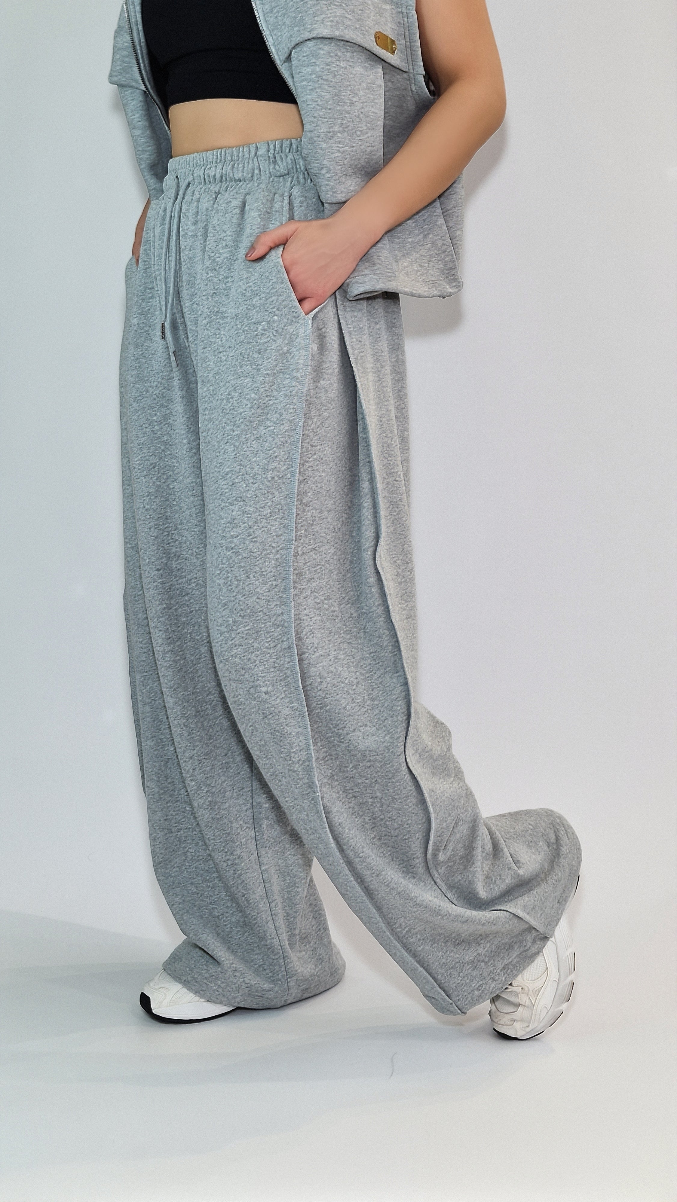 Calças de Perna Larga em Malha Fluida com Ajuste na Bainha